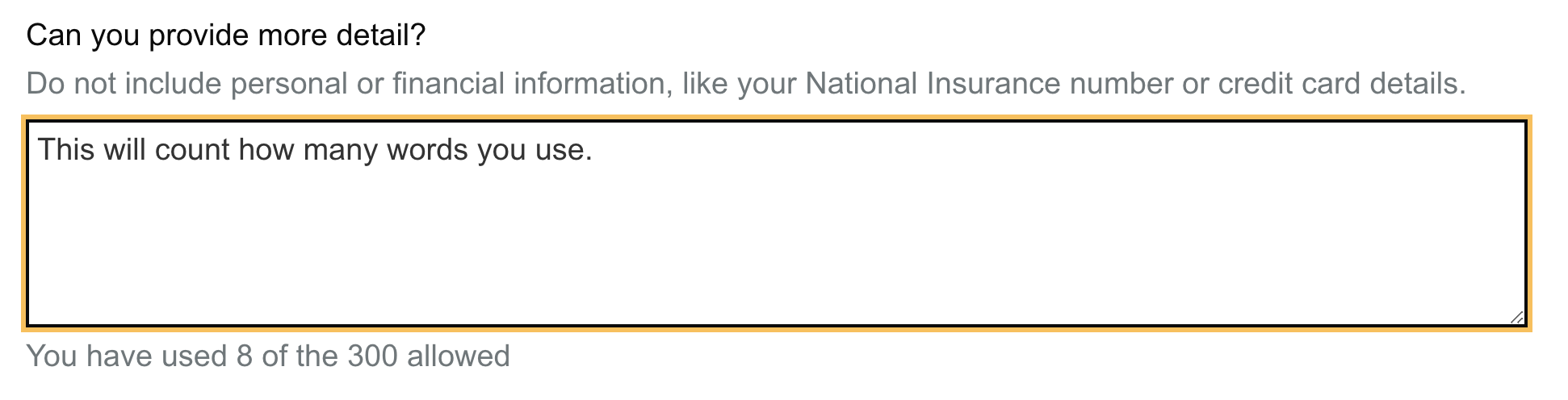 "Do not include personal or financial information, like your National Insurance number or credit card details.",